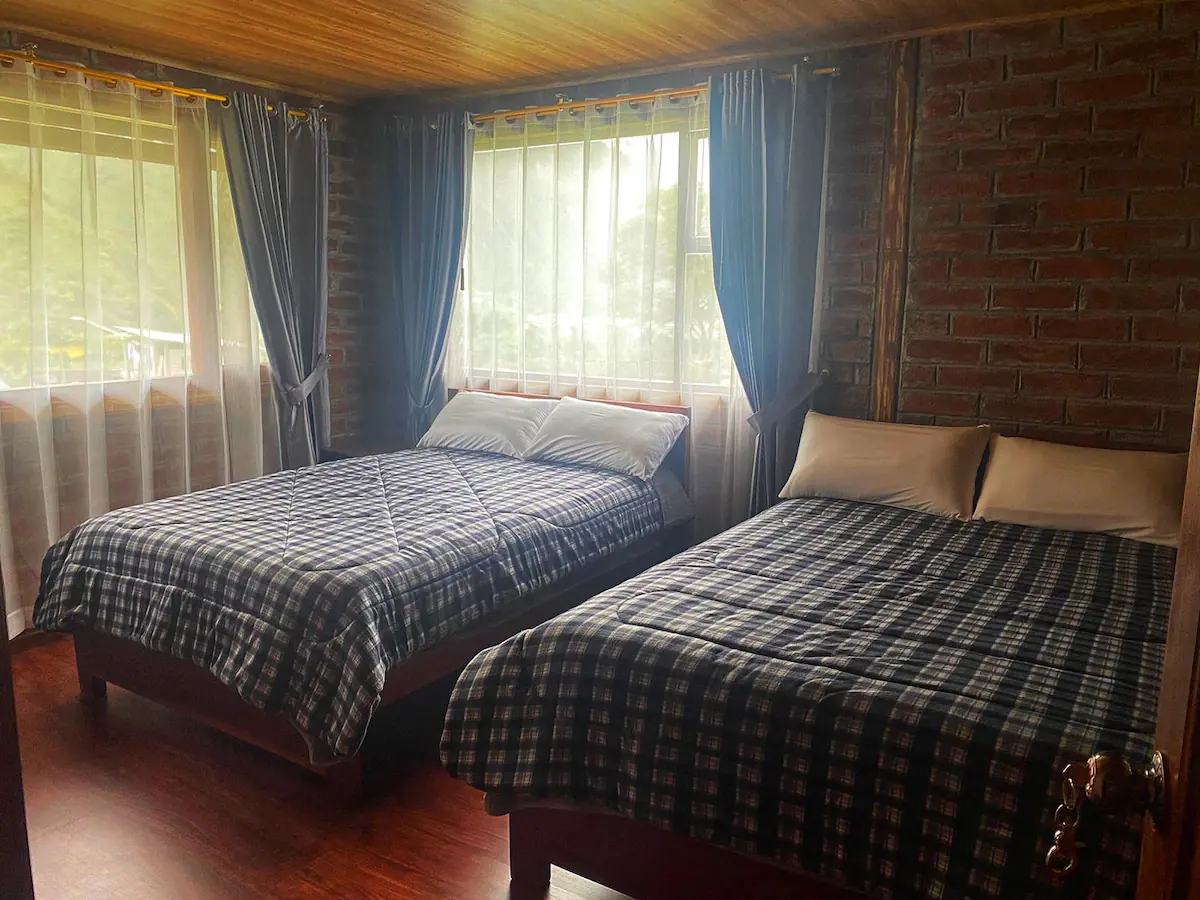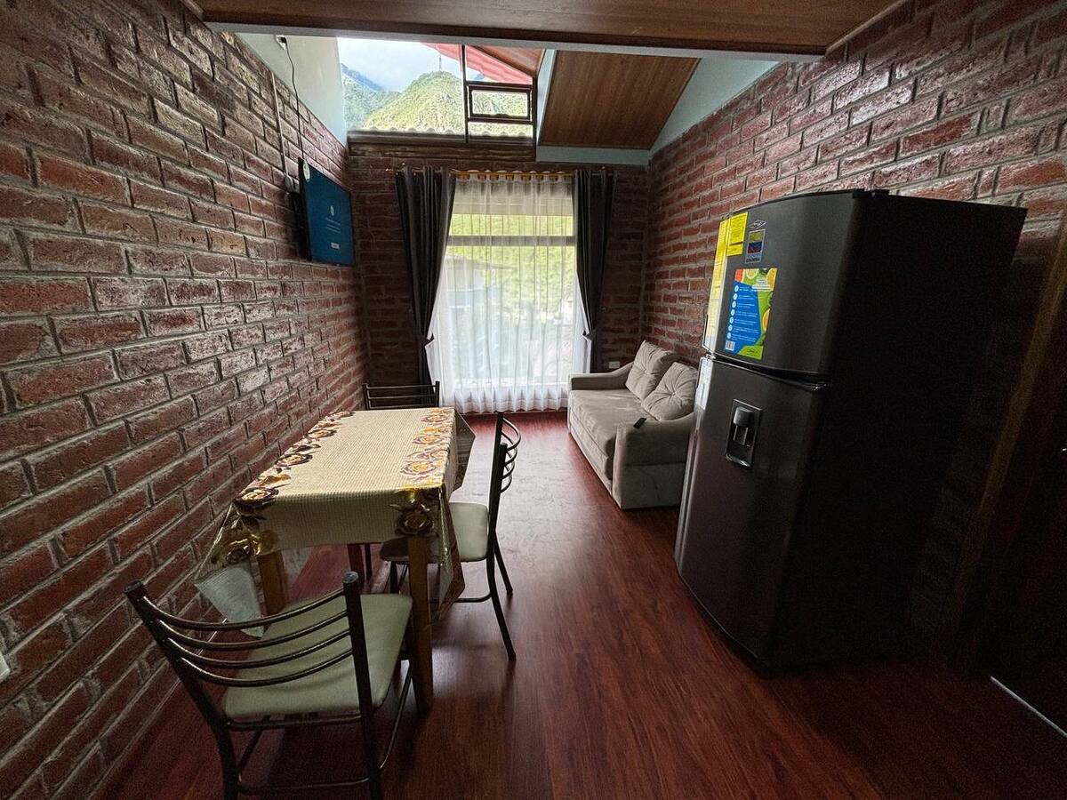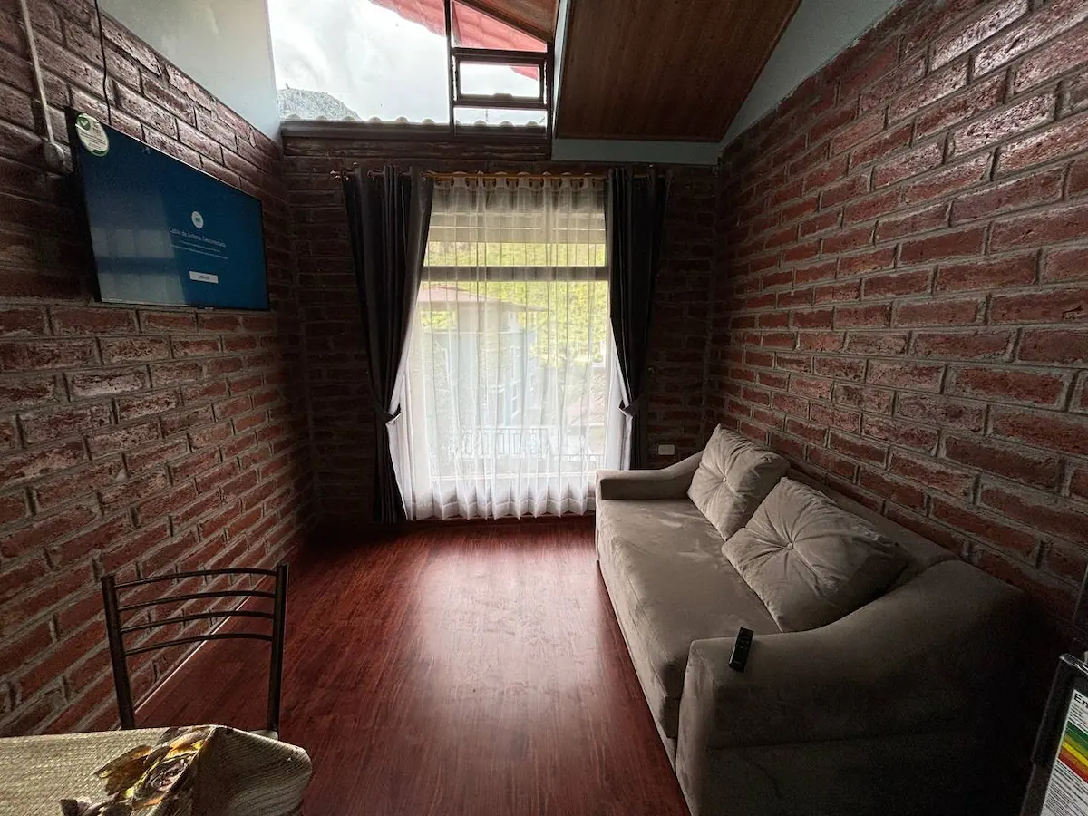Esta cabaña consta de: un dormitorio, dos camas matrimoniales, sala con sofá-cama, TV cable, Wi-Fi, baño con ducha de agua caliente, cocina, parqueadero privado
